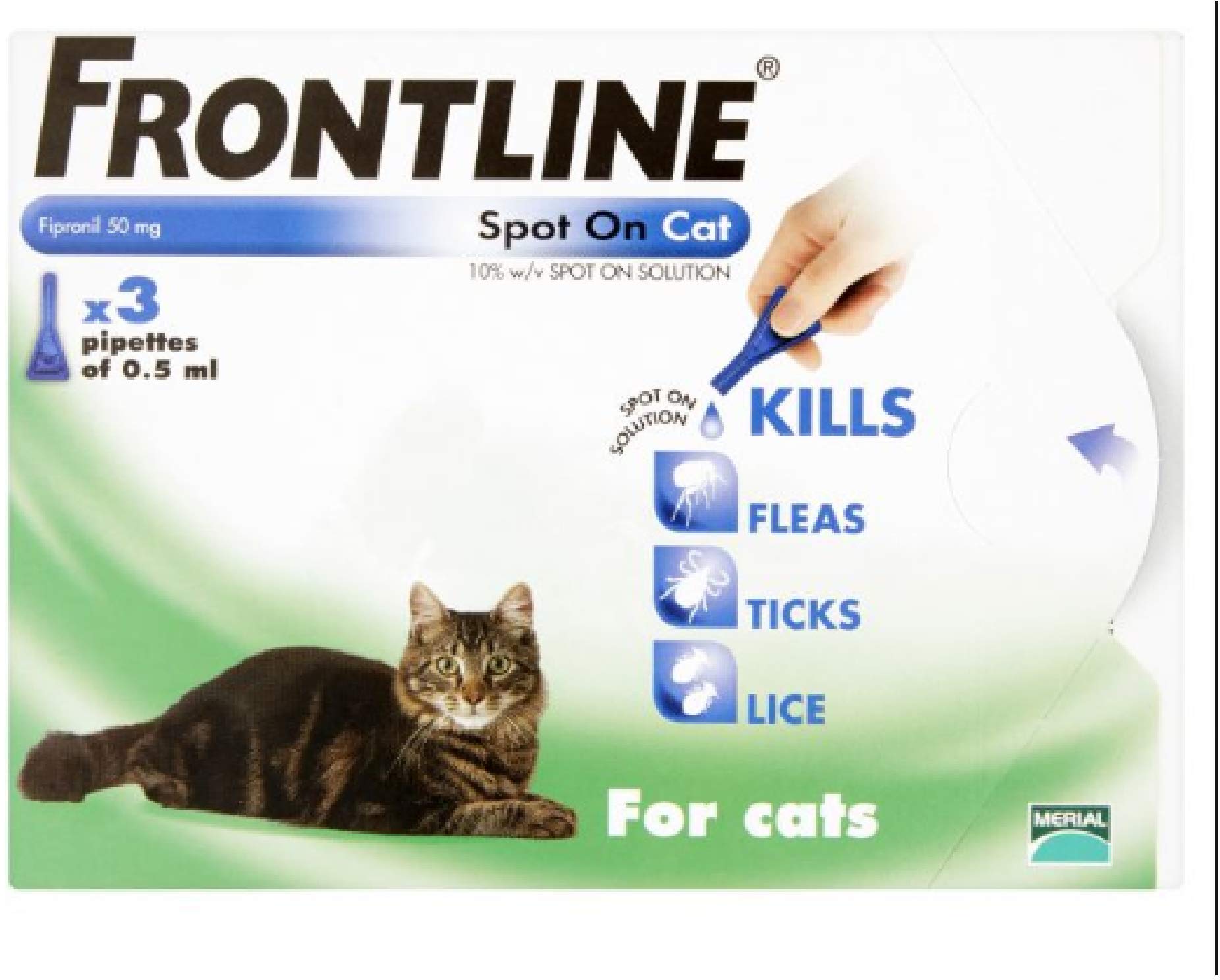 FREE POSTAGE & PACKING FOR CATS (3 PIPETTE) FRONTLINE SPOT ON FOR CATS FOR THE KILLING AND PREVENTION OF FLEA AND TICK INFESTATIONS AND THE CONTROL OF BITING LICE TRUST FRONTLINE SPOT ON THE LEADING BRAND FOR PETS PROTECTION AGAINST FLEAS, TICKS AND LICE – EASY TO USE SIMPLY APPLY IT TO THE SKIN AND IT SPREADS EXTERNALLY TO PROTECT THE WHOLE PET – HIGHLY EFFECTIVE AND LONG LASTING KILLS ADULT FLEAS WITHIN 24 HOURS FOR UP TO 5 WEEKS IN CATSKILLS TICKS WITHIN 48 HOURS FOR UP TO 1 MONTH IN CATS. SUITABLE FOR USE ON KITTENS OF ALL BREEDS FROM 8 WEEKS OF AGE, PROVIDING THE KITTEN WEIGHS MORE THAN 1KG PETS CAN BE HANDLED AS SOON AS THE APPLICATION SITE IS DRY BATHING OR WATER IMMERSION 48 HOURS AFTER APPLICATION DOES NOT AFFECT THE DURATION OR EFFECT OF FRONTLINE SPOT ON CATS FLEAS EVERY 5 WEEKS EVERY 2 MONTHS WHERE FLEA ALLERGY DERMATITIS HAS BEEN PREVIOUSLY DIAGNOSED BY A VET MONTHLY APPLICATION IS REQUIRED.